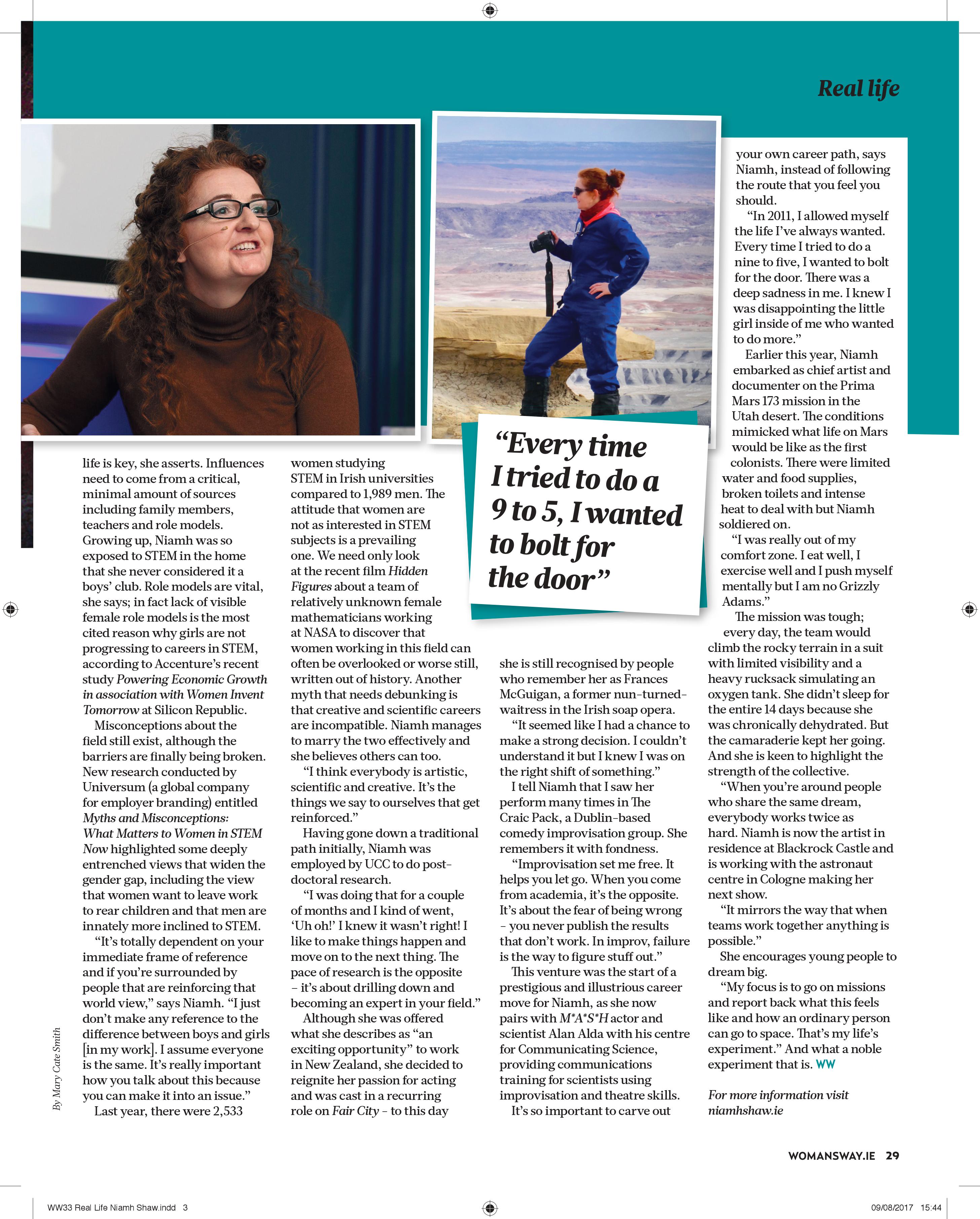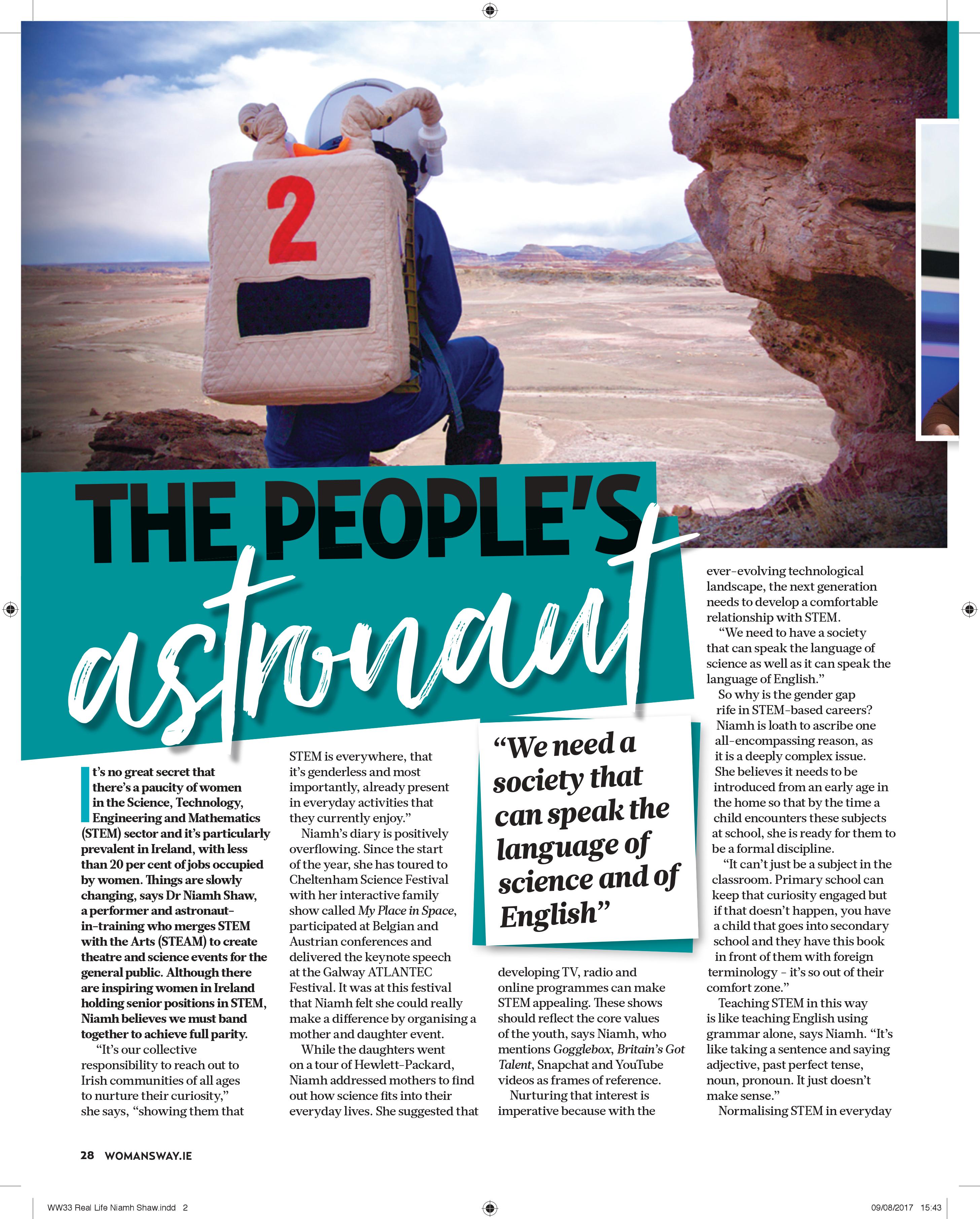 Editorial Magazines Woman's WayNiamh Shaw – The People’s Astronaut by marycatesmithMarch 25, 2019May 1, 2019 Share this: Click to share on X (Opens in new window) X Click to share on Facebook (Opens in new window) Facebook Like Loading... Related